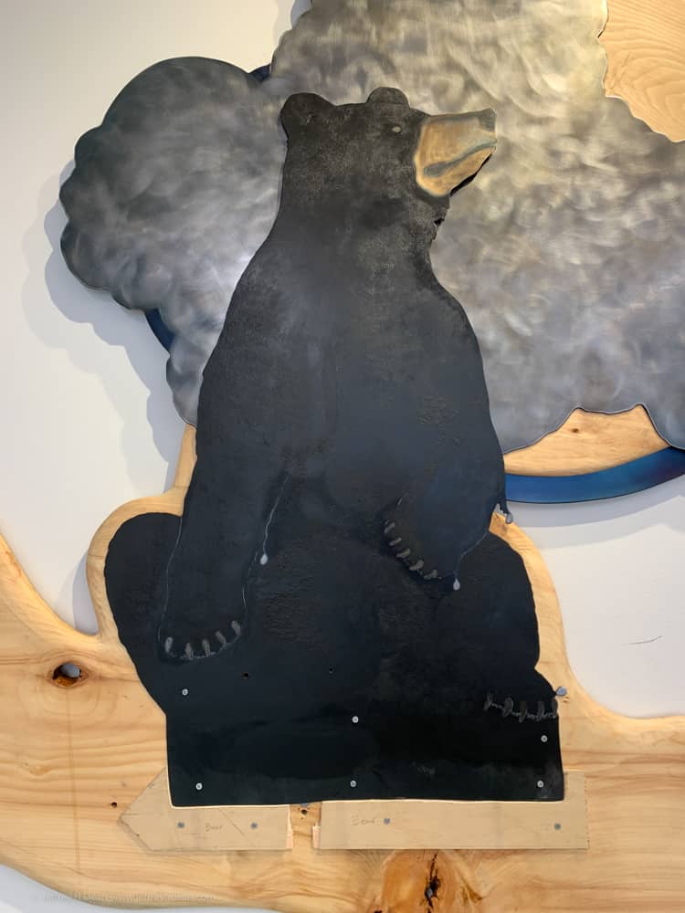 ‘Oh My Hero’ is a metal and wood wall art piece depicting a golden doodle helping a frantic ground squirrel escape from a very hungry grizzly bear.
