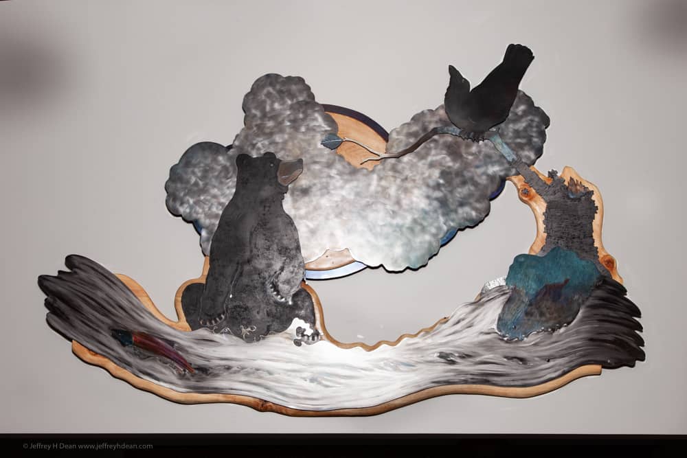 This is my second version of ‘The One That Got Away.’ The wood is spruce and the metal is a mixture of hot and cold-rolled steel. A weary salmon sneaks past a fishing black bear with the help of a raven.