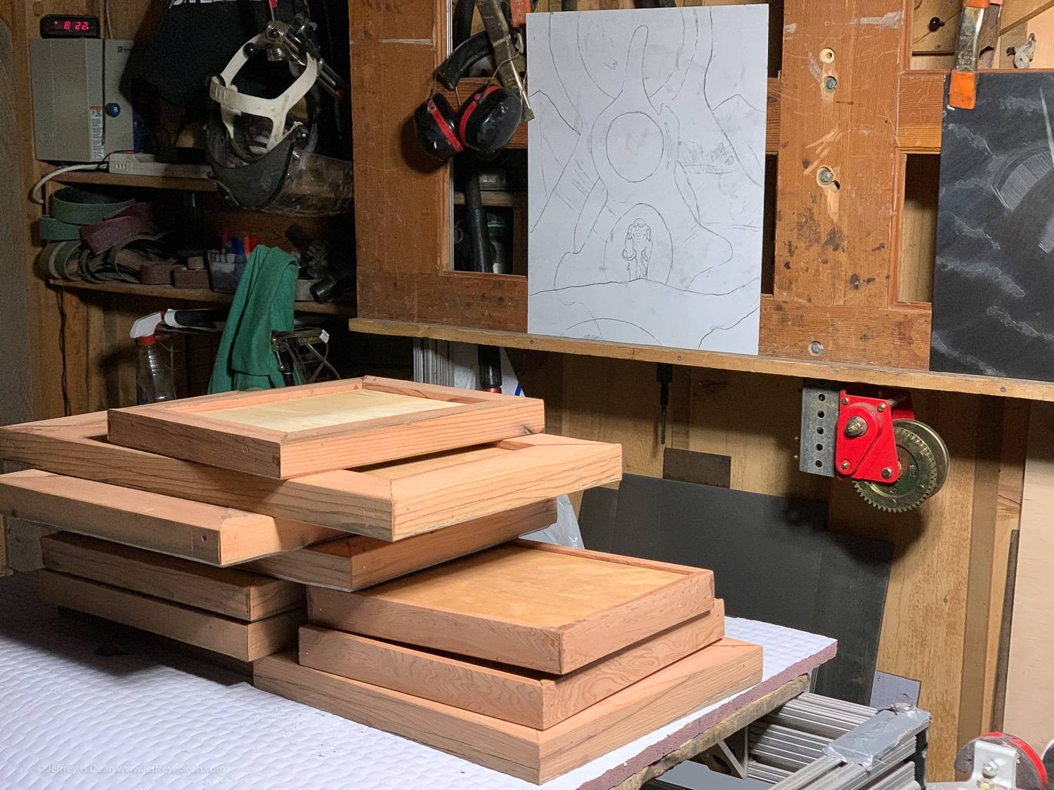 With the engravings clearcoated and frames assembled, all that’s left is to oil the wood, paint the back panels, and mount the engravings.