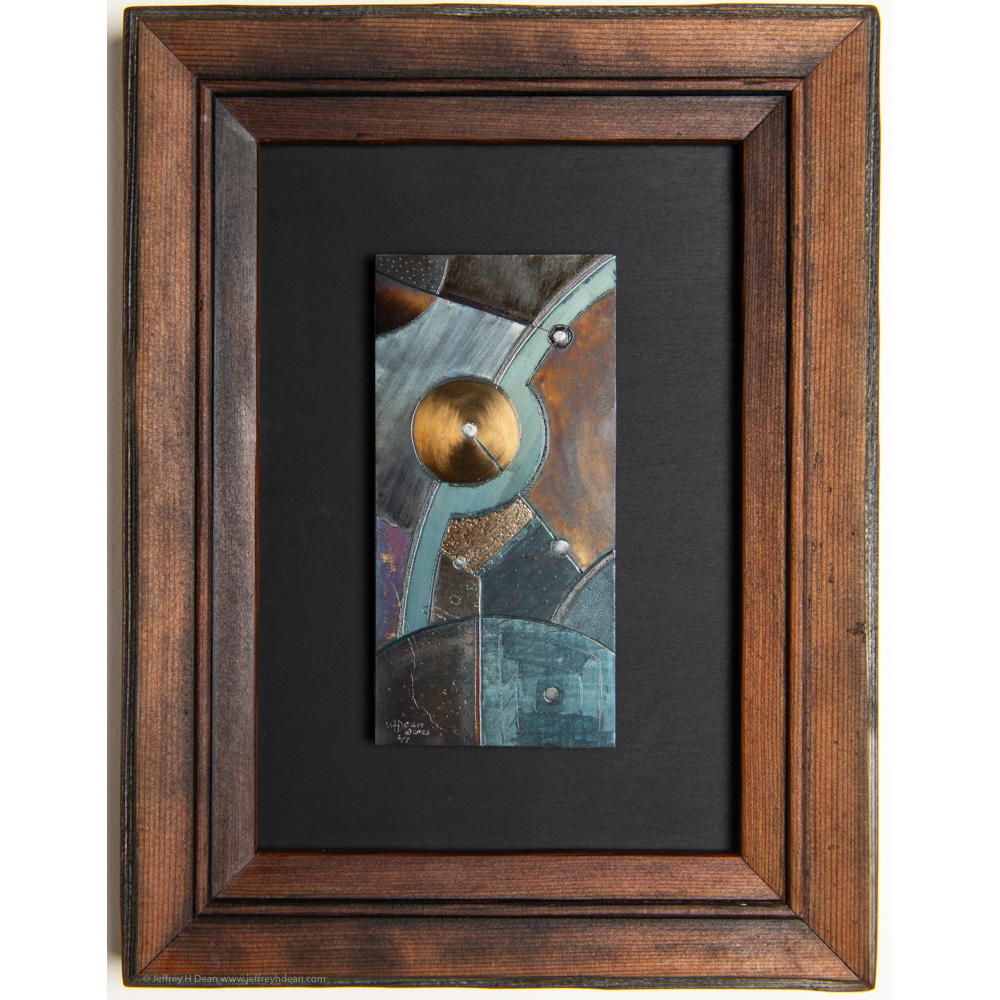 One of a series of small geometric abstract heat-colored steel engravings inspired by celestial and other themes. Arc of Summer 2 began as a quick charcoal sketch on a whitened piece of cold-rolled steel scrap. I made the initial design without forethought, working to refine it and make it harmonious, then adding the grinding textures and heat colors in the same spontaneous spirit.