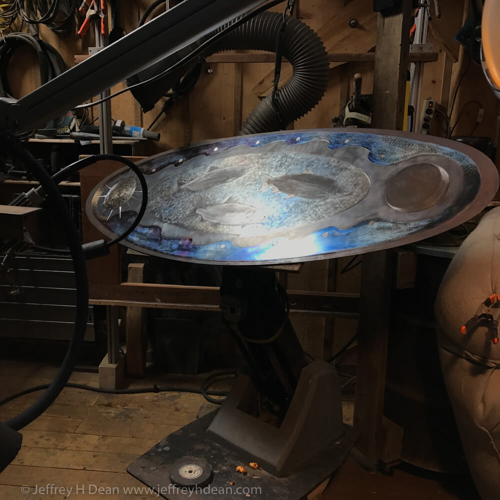 This heat colored steel metal wall art was inspired by the ocean stage of the silver salmon’s life cycle. It depicts the pull of the moon, the cycle of days and nights, the sun and the stars, and life in the ebb and flow of the open ocean between the tides and their imminent return trip to the headwaters from whence they came.