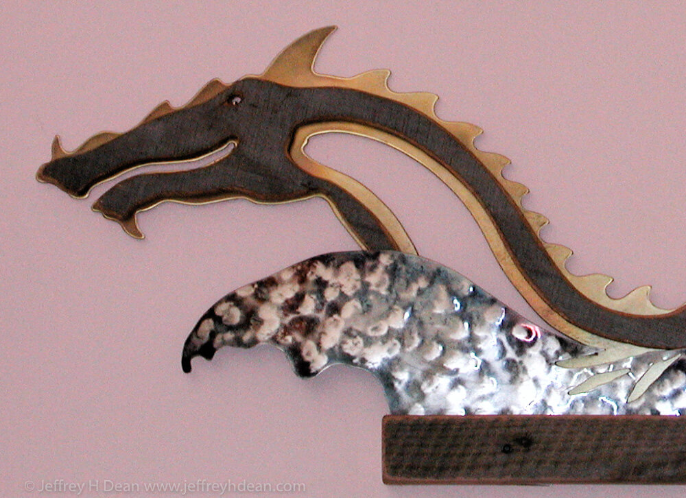 - Frolicking sea dragon in stainless steel, weathered fir and brass.